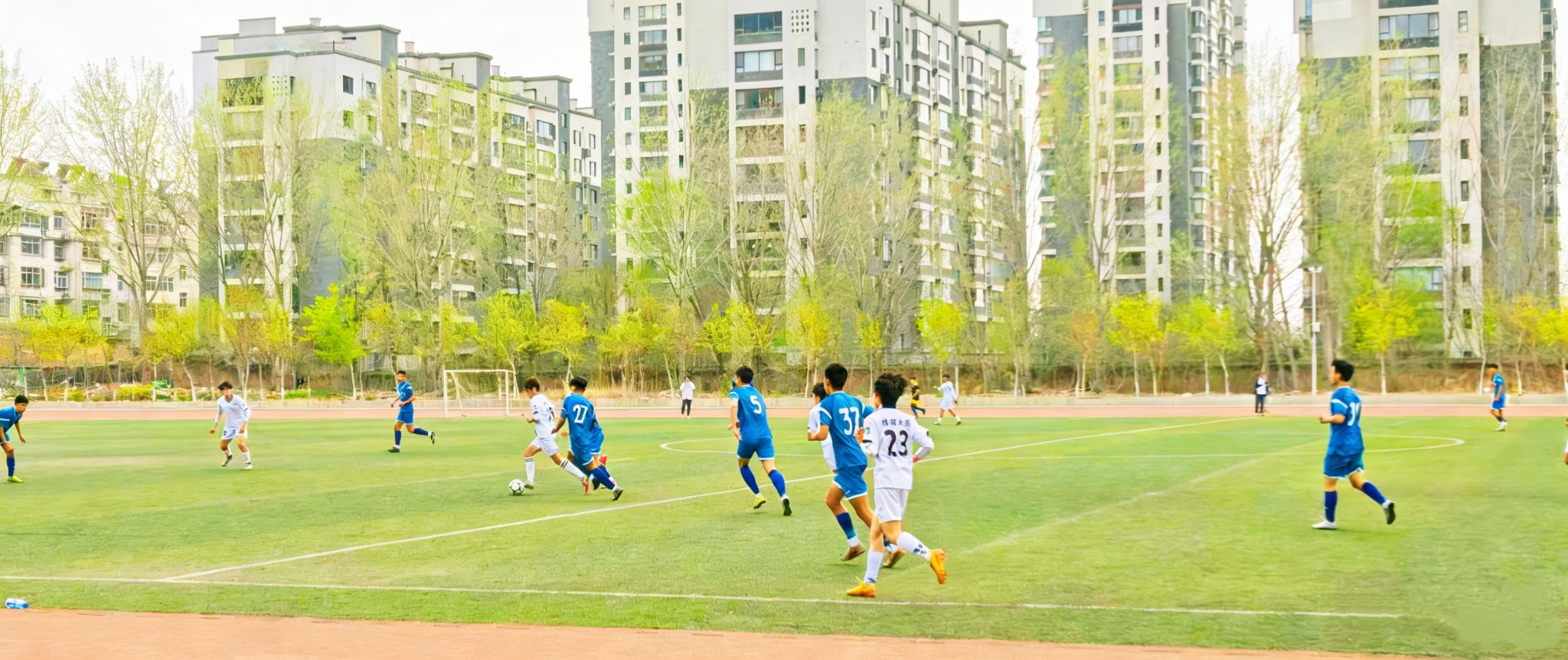 为深化校际体育文化交流,打造具有体育特色的招生宣传品牌,3月26日,济南大学体育学院以“绿茵搭桥,研学共进”为主题,邀请山东师范大学附属中学足球队走进校园,与我校足球队展开了一场精彩纷呈的友谊交流赛。济南大学体育学院副院长董昱、车雯出席活动,山师附中足球队多名队员的家长到场观赛。